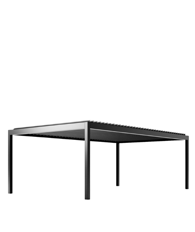 The bioclimatic pergola Nuun Eco is a modern alternative to traditional awnings and umbrellas. It offers an elegant and functional roofing solution, creating a comfortable outdoor living space. The adjustable louvered roof allows you to control the amount of light and provides effective protection from sun and rain.